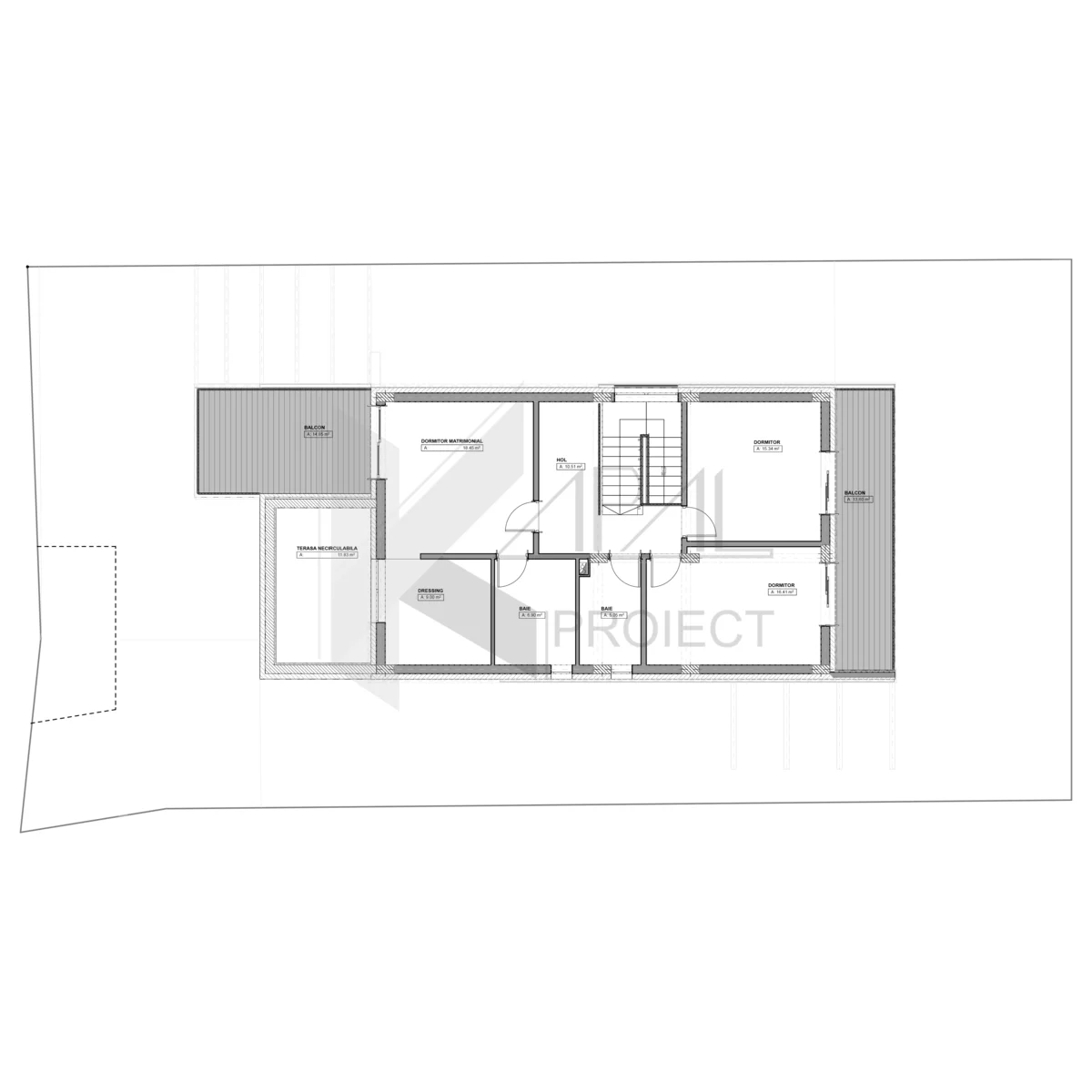 La etaj, zona de noapte este bine proporționată: dormitorul matrimonial (18,45 mp) are dressing (9,00 mp), baie proprie (6,90 mp) și balcon (9,45 mp). Dormitoarele A (16,41 mp) și B (15,34 mp) împart o a doua baie (5,05 mp), iar balconul de 13,60 mp creează o legătură cu exteriorul, aducând lumină și perspective ample.
