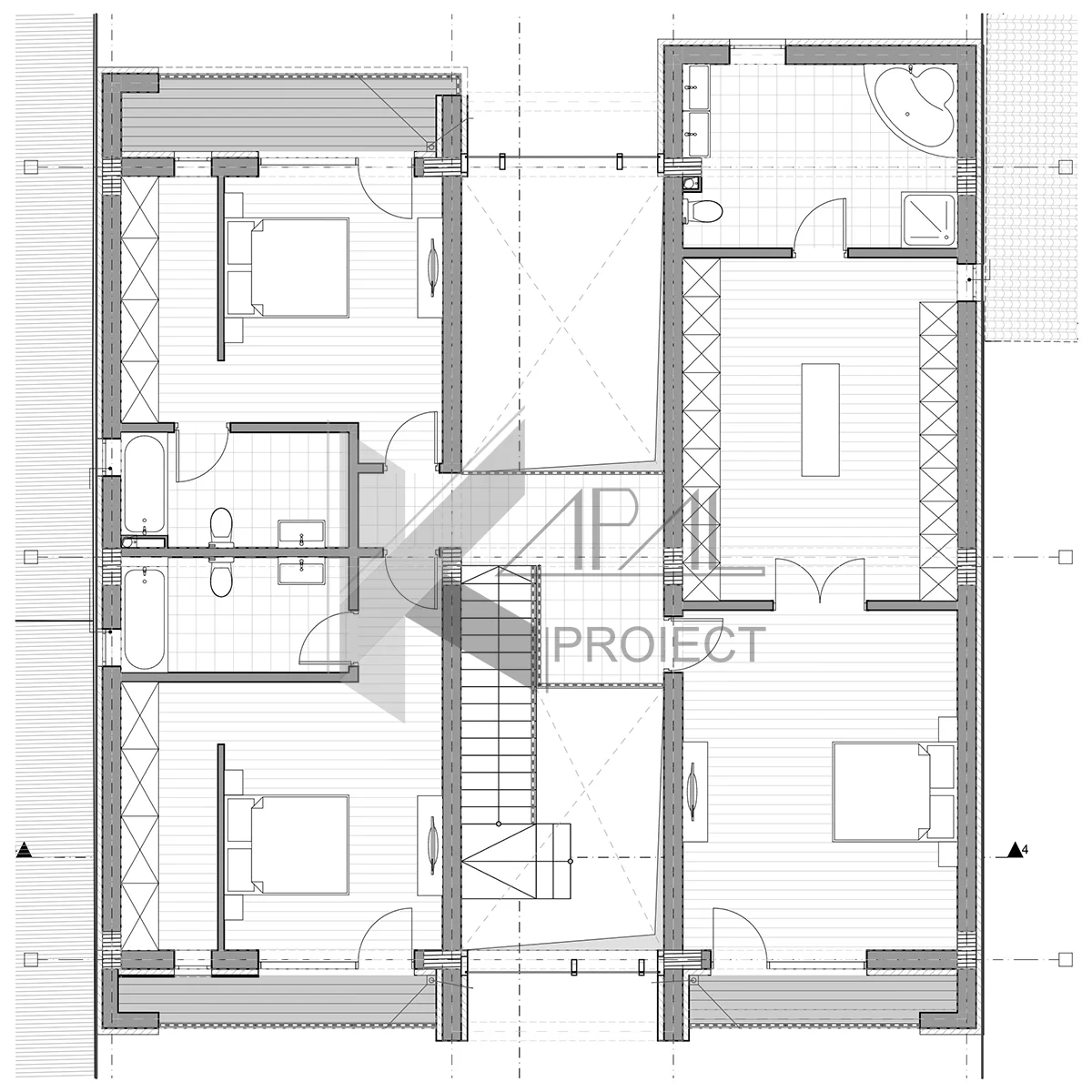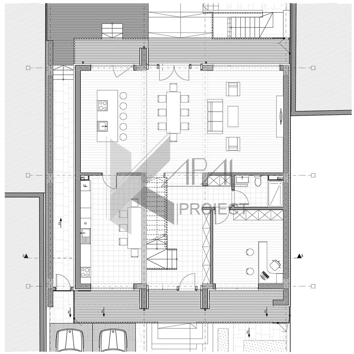 Cromatic, proiectul mizează pe alb – lemn – antracit, punând în evidență linia modernă și textura materialelor. În ansamblu, K139 este o casă cu suprafețe generoase (433,76 mp utili) și scenarii de locuire flexibile, ideală pentru o familie numeroasă sau pentru gazde care adoră socializarea.