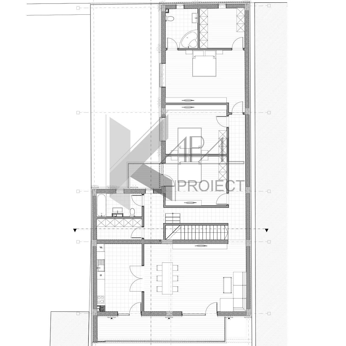 Parterul integrează spațiul comercial vitrat, alături de zona de locuire, asigurând separarea clară între activitatea profesională și cea domestică. Zona rezidențială beneficiază de un living și bucătărie open-space, bine iluminate natural, precum și de un dormitor și spații auxiliare.