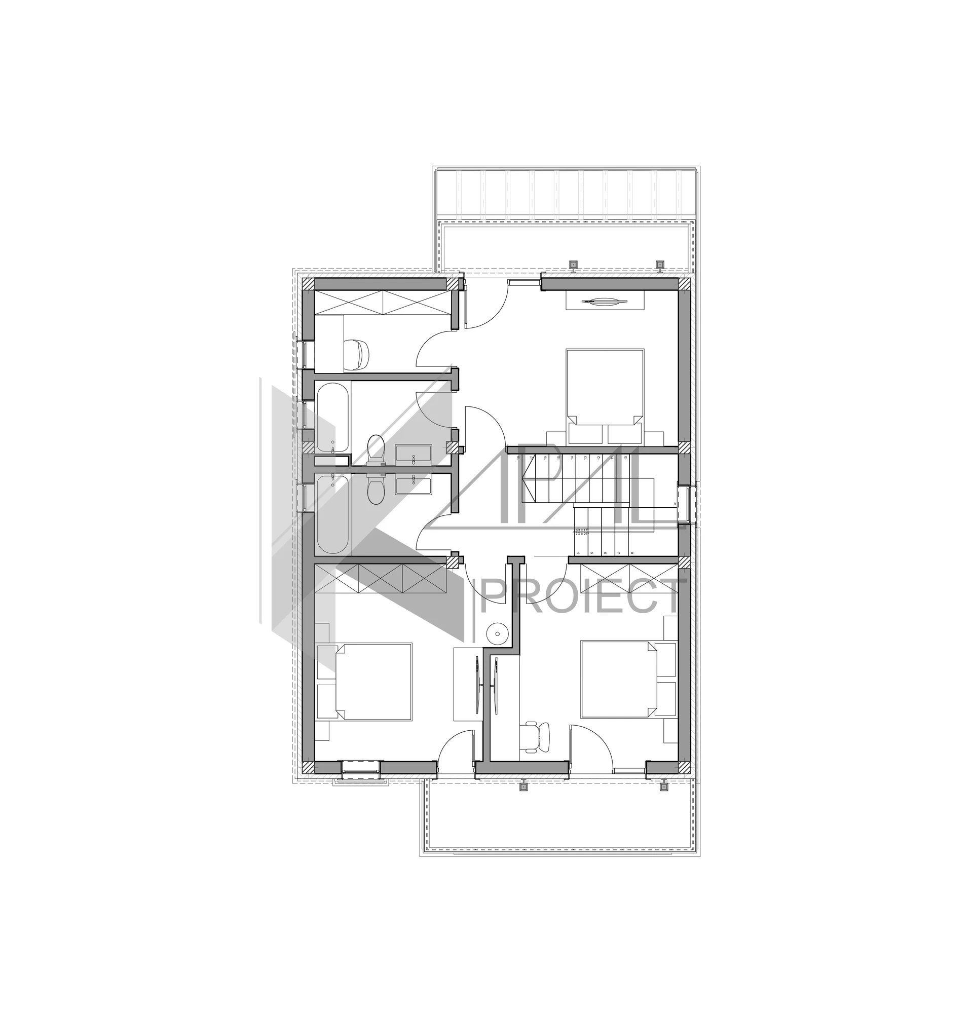 Etajul este dedicat zonei de noapte și oferă dormitoare generoase, fiecare cu iluminare naturală optimă și acces la balcoane. Organizarea asigură intimitate, funcționalitate și circulații fluide.