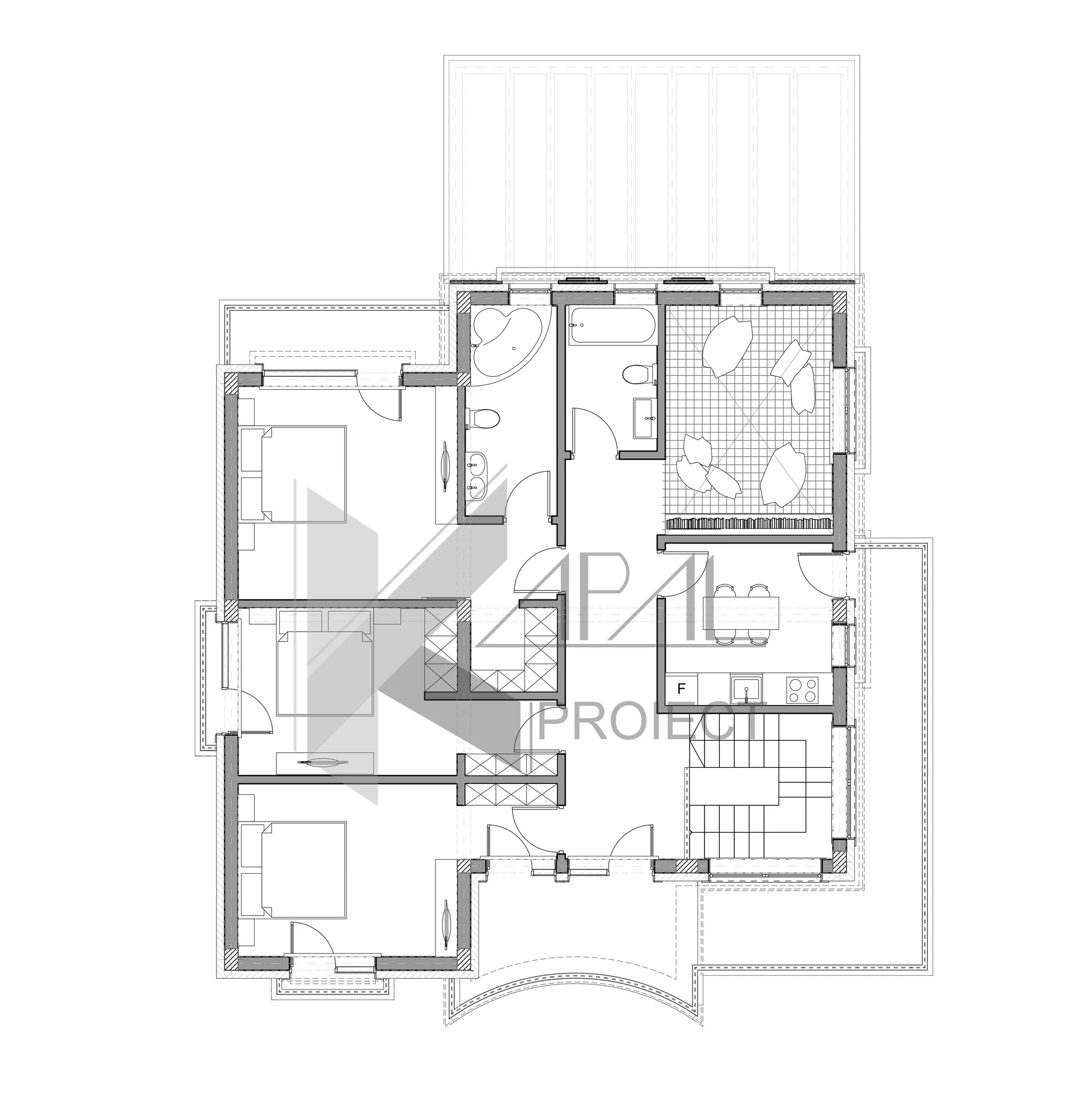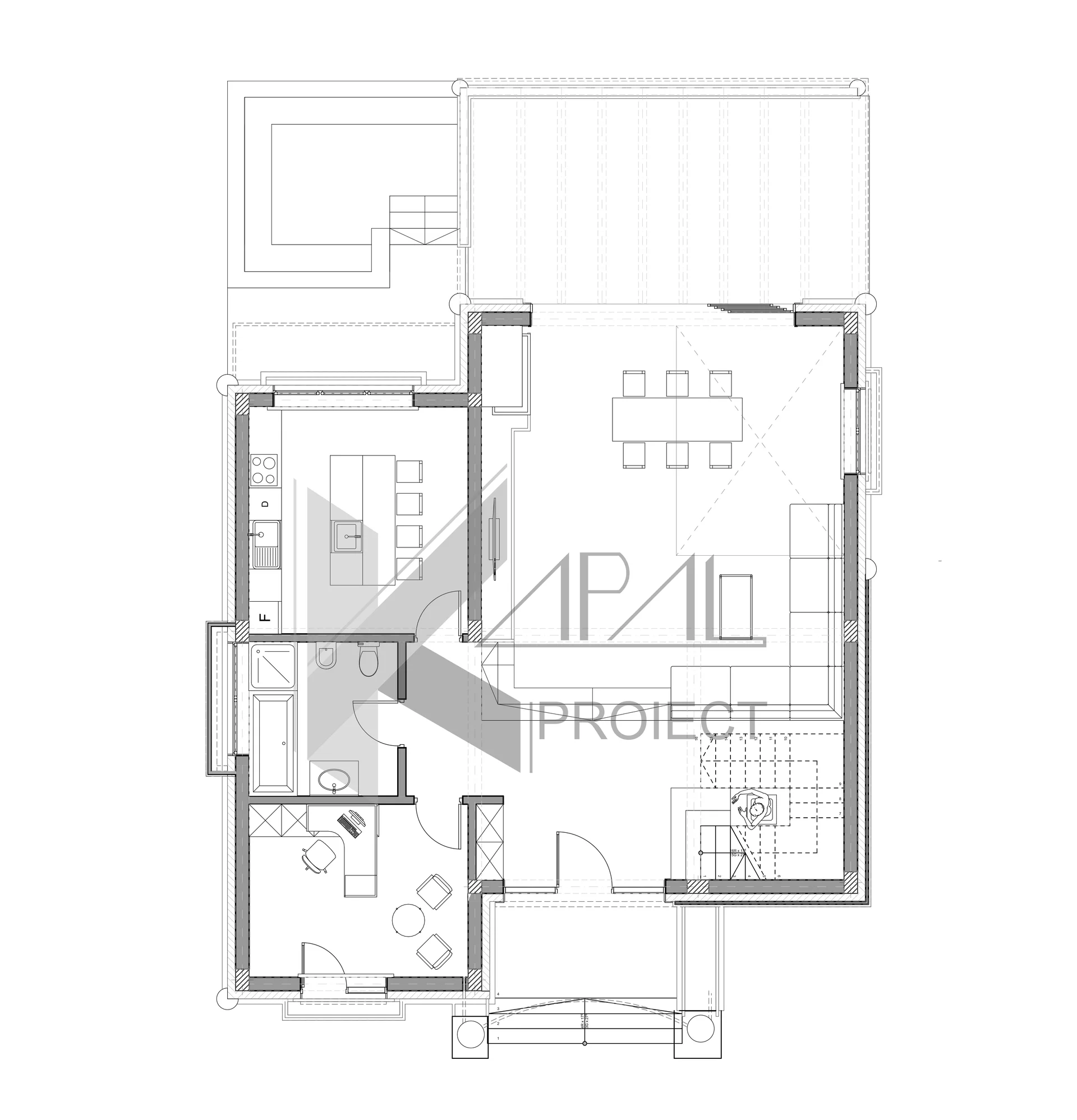 Casa este concepută pentru o familie care își dorește spații generoase, funcționalitate clară și zone dedicate relaxării. Organizarea interioară oferă atât zone sociale ample, cât și spații private bine delimitate. Elementul arhitectural spectaculos al proiectului este golul peste dining, peste care este prevăzută o structură metalică cu plasă suspendată destinată relaxării, cititului sau activităților recreative — un detaliu contemporan integrat într-un concept clasic.