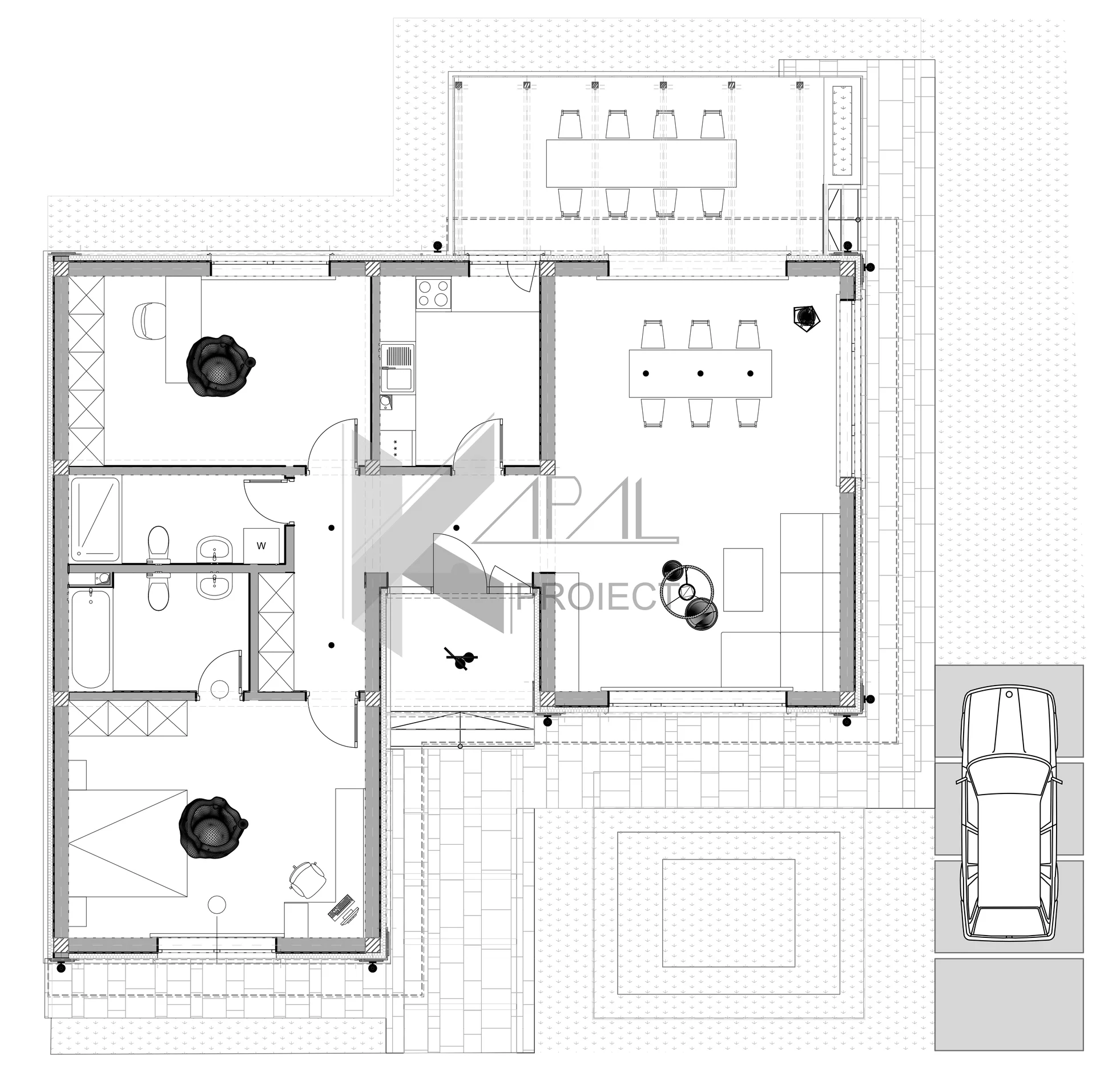 Accesul principal este protejat și integrat într-un mic spațiu retras, cu vegetație decorativă, care creează o tranziție elegantă între exterior și interior. Terasa acoperită, amplasată în zona de zi, devine o extensie naturală a livingului și un spațiu ideal pentru relaxare și socializare.
